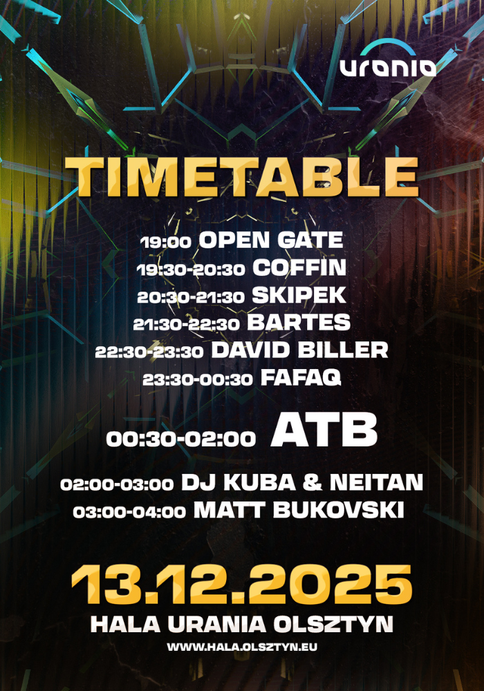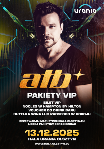 Z okazji 2. urodzin Hali Urania zapraszamy na wyjątkowy wieczór z udziałem legendarnego artysty światowej sceny muzyki elektronicznej – ATB. To wydarzenie, które na długo zapisze się w historii naszej hali i kalendarzu kulturalnym Olsztyna.