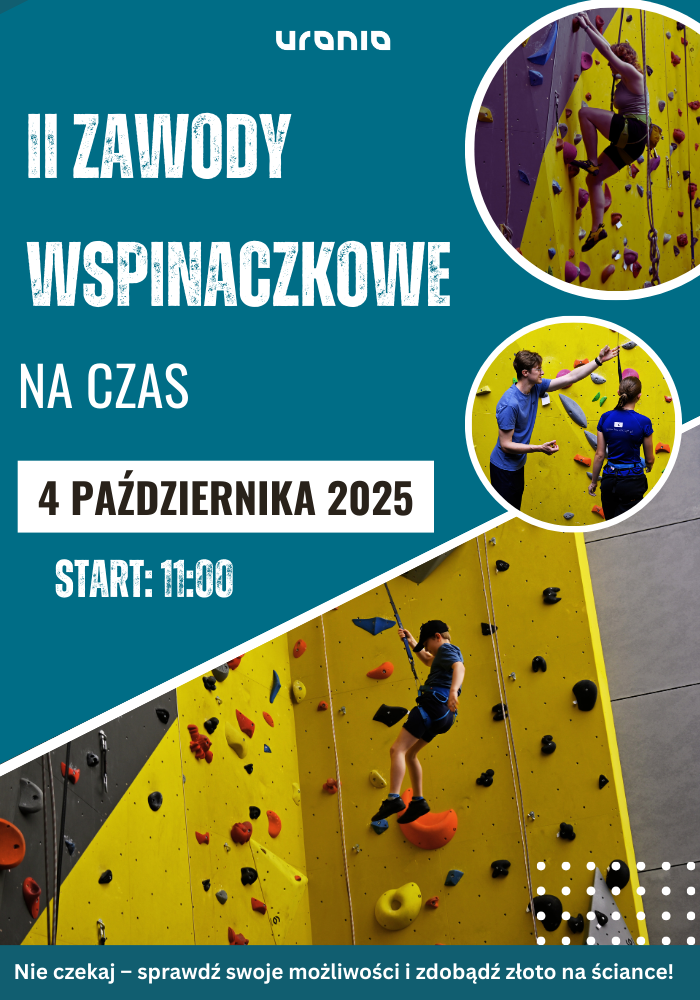 Zapraszamy wszystkich pasjonatów wspinaczki, zarówno młodszych, jak i starszych, do udziału w kolejnej edycji Zawodów wspinaczkowych na czas, które odbędą się 4 października 2025 roku w Hali Urania w Olsztynie.